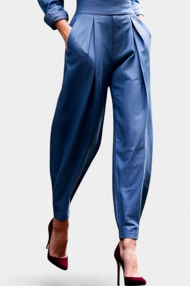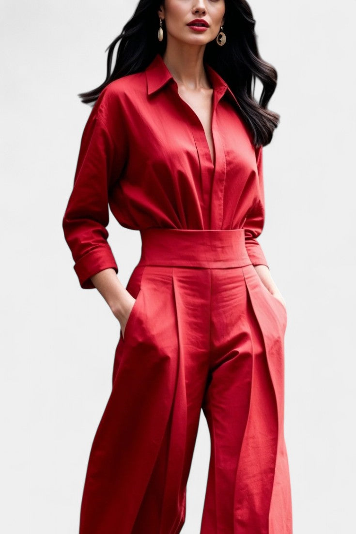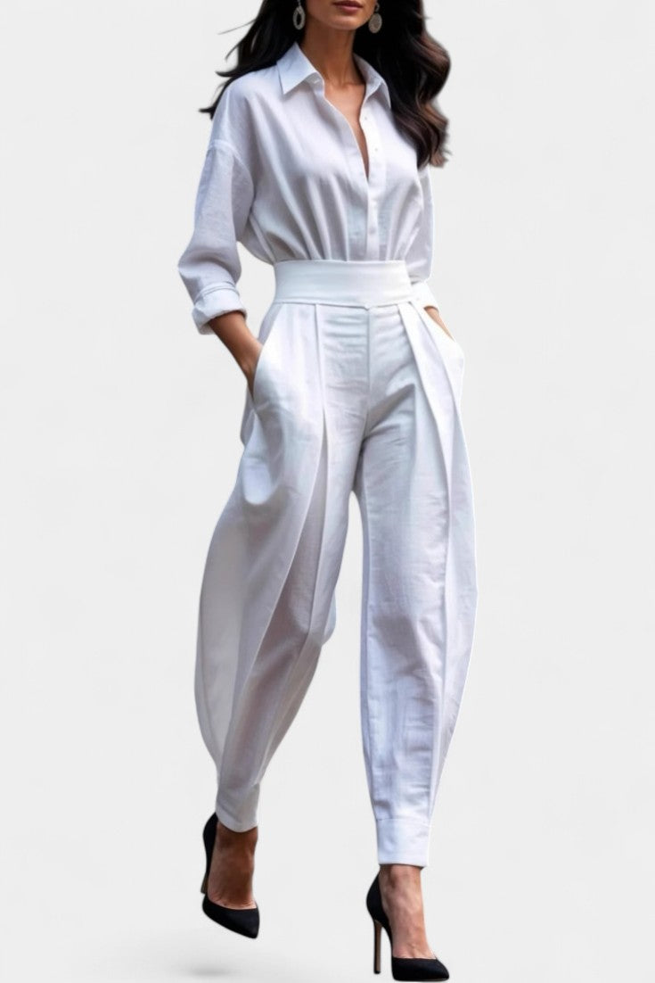 Un ensemble épuré et naturellement sophistiqué, pensé pour une élégance sans effort. Lía associe une chemise fluide à boutons à un pantalon taille haute plissé, créant une silhouette équilibrée, moderne et parfaitement maîtrisée. La coupe met en valeur la taille tout en laissant une grande liberté de mouvement, apportant une sensation de légèreté et de confort raffinés. Une proposition essentielle pour un style à la fois calme, affirmé et intemporel.