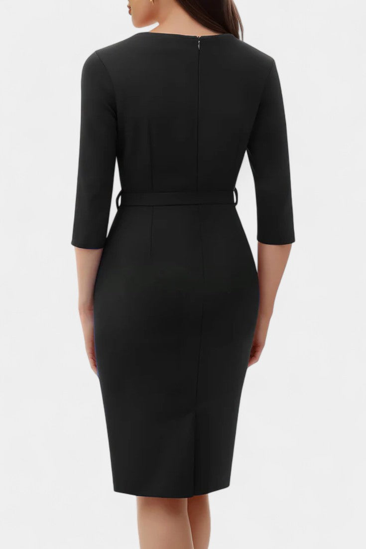 Hada Robe Midi Fourreau à Col Cranté, Ceinturée et Manches Trois-Quarts